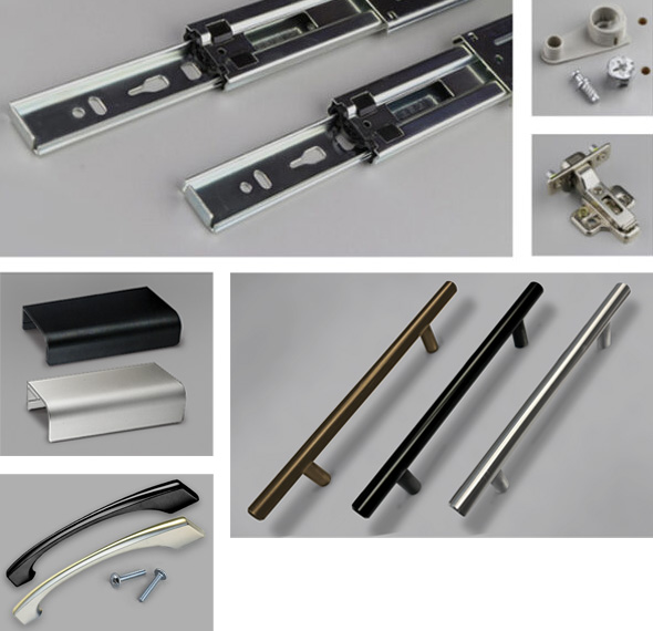 Doors are attached with heavy duty 6-way adjustable Euro hinges for easy and accurate adjustment. High-quality full-extension drawer glides rated at 100 lb. capacity attach drawers to the cabinets. Finally, choose from 8” bar-style pulls (in brushed chrome, black, oil rubbed bronze), “modern arch” pulls ( in satin nickel or matte black), or standard handles (in matte black or satin nickel).
