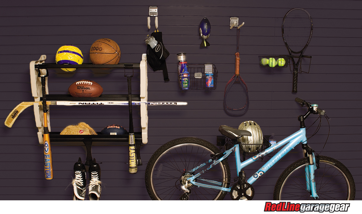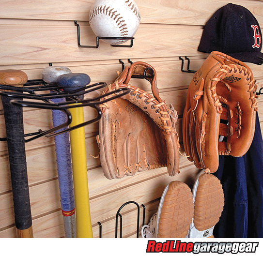 There are sports equipment accessories that go right on your slat wall. The accessories give you space to store equipment for any number of sports.